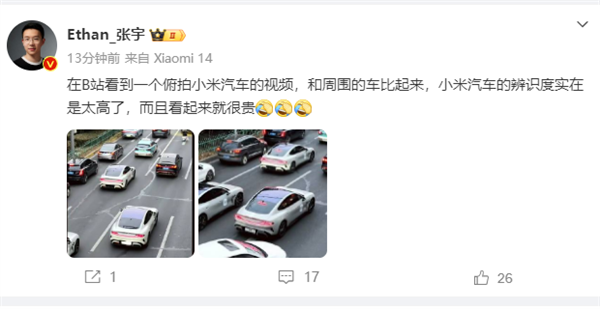 博主晒小米汽车俯拍图:辨识度太高了 看起来就很贵